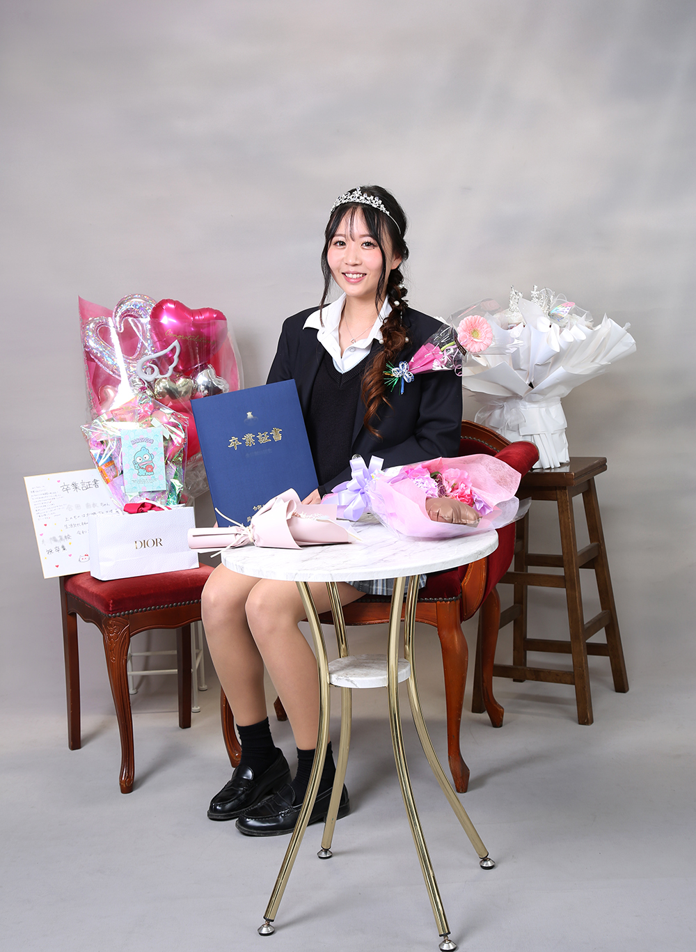 卒業おめでとうございます。式が終わってから二組の撮影がありました。花束やお祝いのプレゼントを沢山持参されましたが、即座に遊び心がメラメラとスイッチON❕に。祝福に囲まれたお姫様気分での演出で、楽しく撮影させて頂きました。撮る方も撮られる方も楽しくが一番です。せっかくだから、ちょいと撮影してみようか!で、気軽にお越しくださいませ。