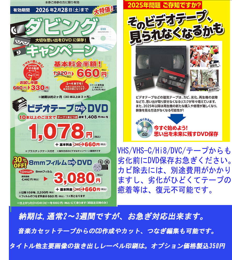 VHS再生機も消滅します。大切な動画は、今すぐにDVDダビングお奨めします。1・2本なら当日仕上げも可能、オリジナルレーベル印刷は、大好評ですよ。ご相談ください。 VHS/VHSC/DVC/HI8/動画メディアDVD-RAM VIDEO等からTV&PCのDVD作成・編集/音楽カセット/LPレコード版からの音楽CD作成。